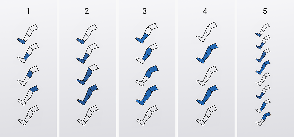 2. Последовательное сжатие: Камеры надуваются одна за другой, начиная с нижней части ноги. Каждая зона удерживается под давлением, пока включается следующая, создавая ощущение постепенного сжатия всей ноги.