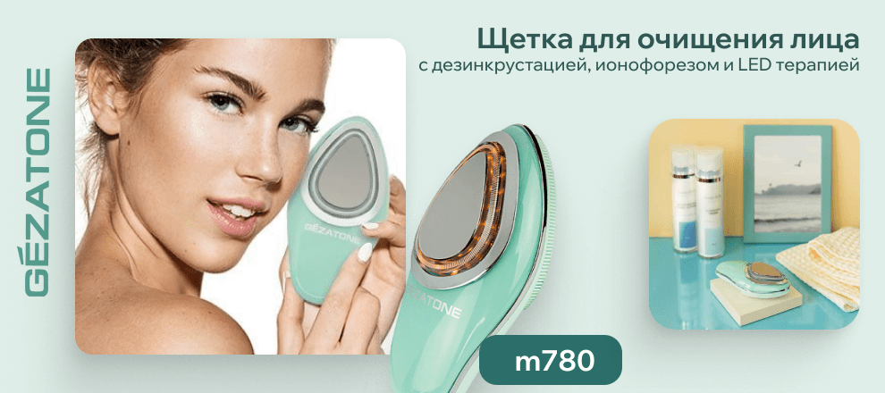 Другой полезный девайс для дневного и ночного ухода — щетка для очищения лица с дезинкрустацией, ионофорезом и LED терапией M780 от Gezatone. Гаджет сочетает шесть методов воздействий, которые улучшают внешний вид и состояние кожных покровов. Аппарат M780 сочетает в себе техники ионного очищения, ионофореза, микротоки, тепло, хромотерапию, высокочастотную вибрацию и брашинг. Щетинки девайса выполнены из высококачественного мягкого медицинского силикона. Очищение можно проводить даже обладателям тонкой и чувствительной кожи. Дополнительное массажное воздействие запускает процессы самоувлажнения, питания, лифтинга, обновления и регенерации кожи. В результате значительно улучшается внешний вид и состояние кожных покровов.
