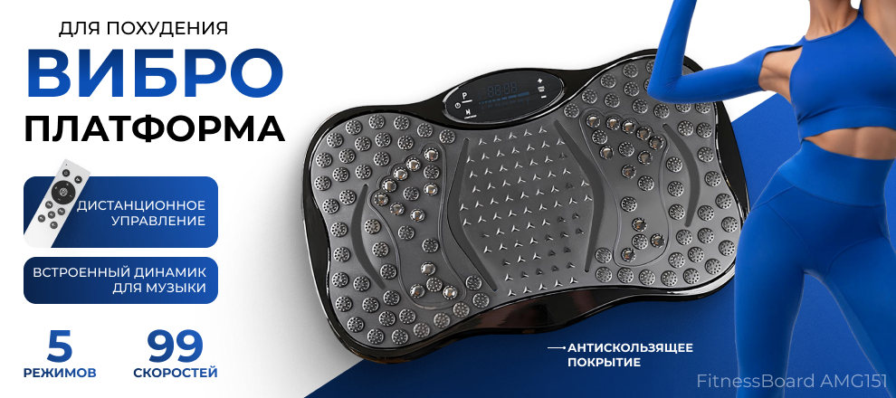 4. Виброплатформа для похудения FitnessBoard AMG151 Виброплатформа FitnessBoard AMG151 подойдет тем, кто нацелен на комплексную коррекцию фигуры, хочет не только подтянуть кожу на боках, но и уменьшить отечность, устранить целлюлит на бедрах и ягодицах, укрепить мышцы в проблемных зонах тела и похудеть. Этот премиальный прибор полностью заменяет фитнес-тренировки, помогает прокачать тело без усилий и нагрузок на суставы.