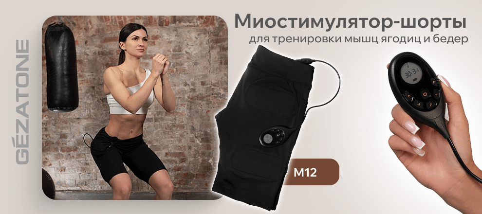 Если вы хотите расширить зону работы EMS тренажера для тела, стоит обратить внимание на миостимулятор-шорты для тренировки мышц ягодиц и бедер M12, Gezatone.