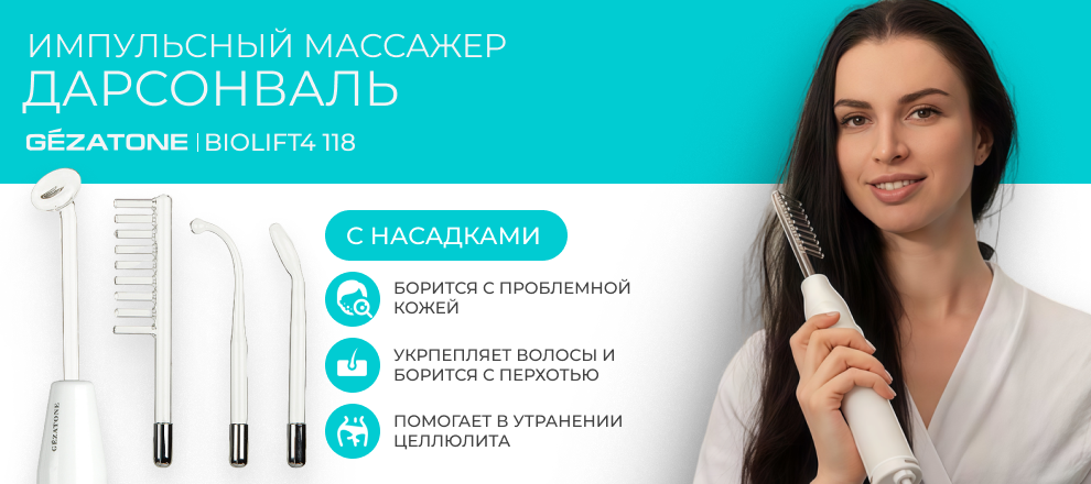 Для эффективной борьбы с проблемной кожей, улучшения роста и уменьшения выпадения волос, избавления от целлюлита и варикоза разработан современный Дарсонваль Biolift4 118 Gezatone с четырьмя сменными насадками.