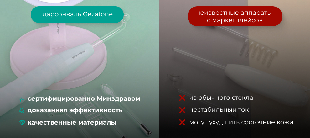 Все что представлено на маркетплейсах под видом дарсонваля за 1500-3000 рублей к медицинской технике отношения не имеет. Электроды дешевых подделок изготовлены из обычного стекла со слабой герметизацией, поэтому их применение небезопасно. Такие приборы не проходят ни одной из проверок, часто не имеют инструкции, дают нестабильный ток, могут приводить к ожогам, нарушению кожного барьера и усилению воспаления.