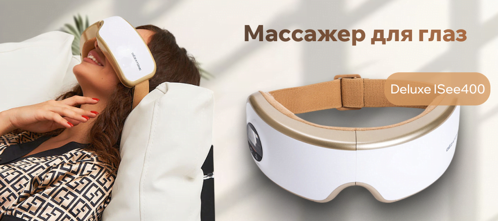 Массажер для глаз Deluxe ISee400 Премиальные очки-массажер комплексно помогают при усталости глаз, возрастных изменениях кожи век, устраняют последствия долгой работы за монитором, недосыпов, хронических стрессов. Девайс поможет восстановить свежесть взгляда, упругость и молодость кожи век, остроту зрения.