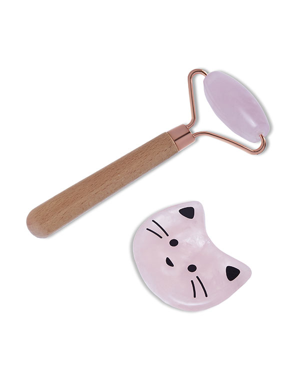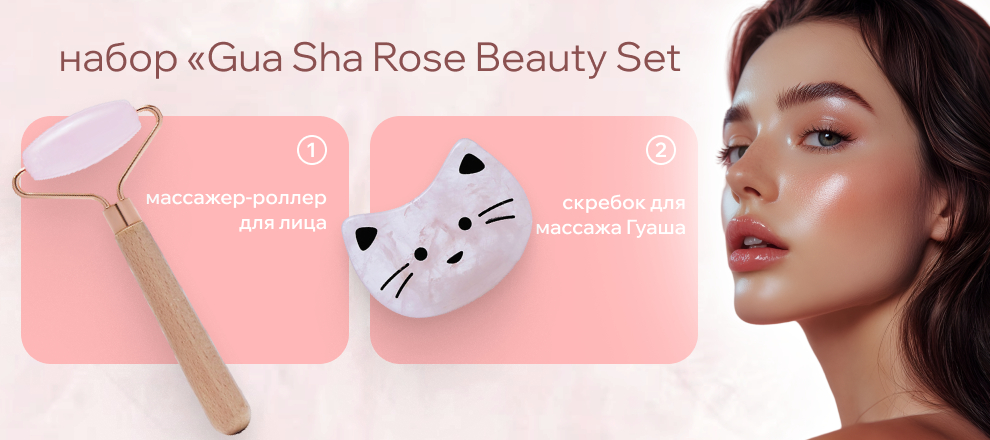Набор Gua Sha Rose Beauty Set в милом молодежном дизайне для мягкого ухода за молодой кожей. Скребок гуаша и роллер из розового нефрита улучшают цвет кожи, устраняют следы недосыпов, снимают отеки, служат профилактике морщин при активной мимике.