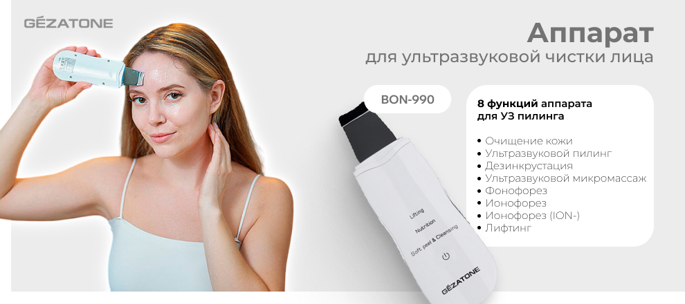 Ультразвуковую чистку можно проводить дома. Для этого у бренда Gezatone есть несколько девайсов. Один из популярных у покупателей — УЗ скрабер BON-990. Он мягко очищает кожу, удаляет любые загрязнения, сужает поры. Кожа не повреждается, сосуды не расширяются, текстура эпидермиса выравнивается.