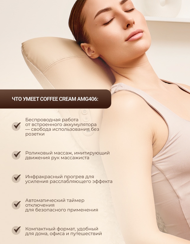 Массажная подушка Coffee Cream AMG406 помогает снизить мышечное напряжение, улучшить самочувствие и создать полноценный релакс в любое удобное время — без посещения салонов и лишних затрат.
