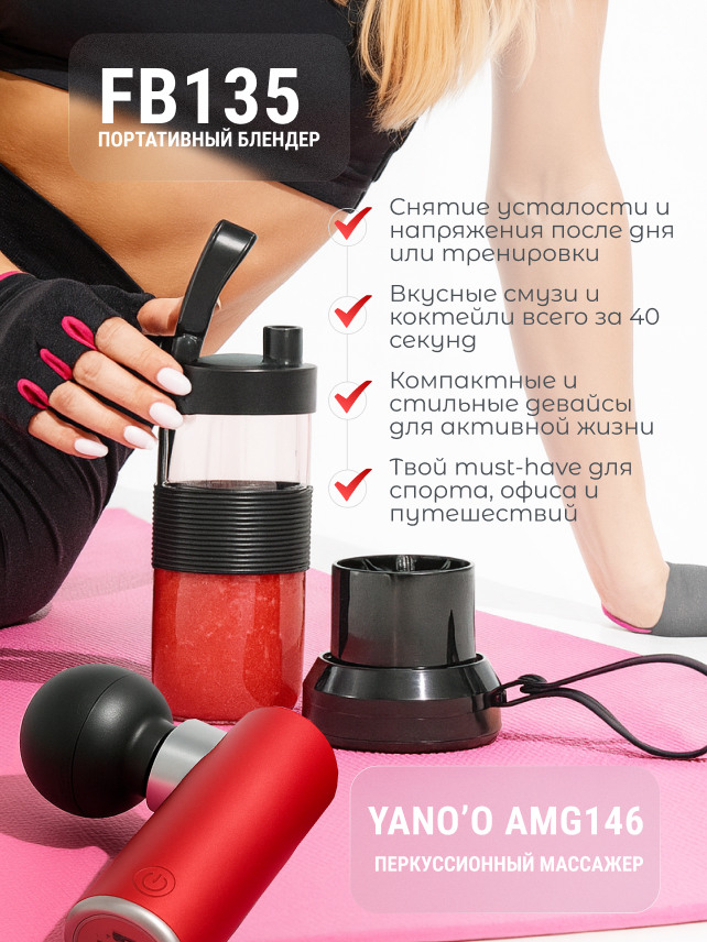 И это ещё не всё! Прекрасным дополнением к активному образу жизни станет портативный блендер FB135 Gezatone. Готовьте смузи, протеиновые коктейли и полезные пюре где угодно — от спортзала до поездки за город.