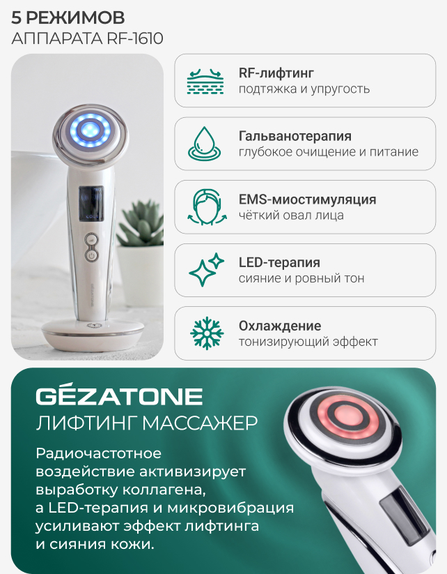 Современные технологии, комфорт и быстрый результат — всё, чтобы ваша кожа выглядела моложе с каждой процедурой. RF-1610 Gezatone делает профессиональный уход простым и доступным — прямо у вас дома.